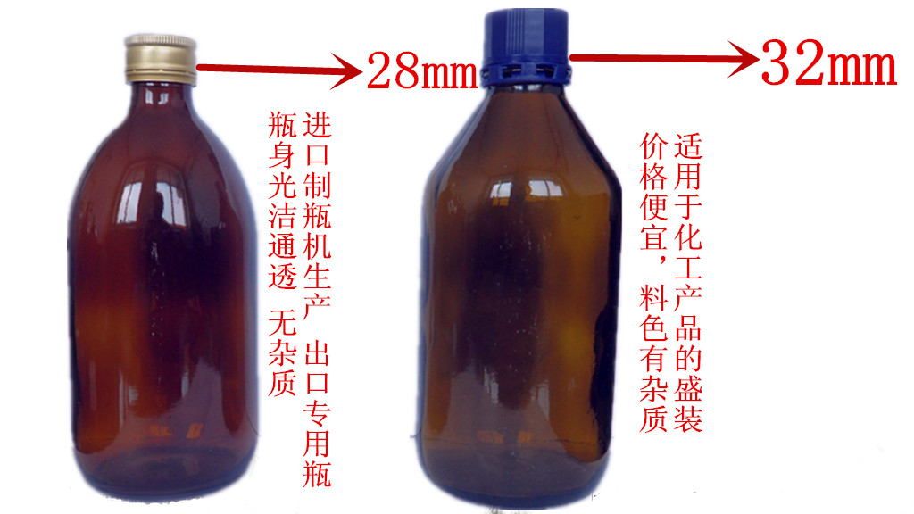 500ml玻璃瓶 我公司有兩種,(右圖)為化工玻璃瓶(瓶口為32口),(左圖)為口服液瓶(瓶口為28口);這兩款玻璃瓶從外觀來看質量完全不同;