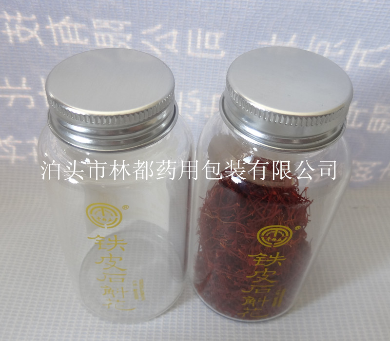 如圖所示, 瓶中所盛裝的產品為藏紅花, 藏紅花是屬名貴的中藥材, 藏紅花的顏色鮮艷,而漂亮,使用通透性較好的玻璃瓶,更展示了藏紅花的魅力。
