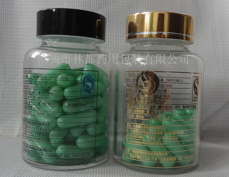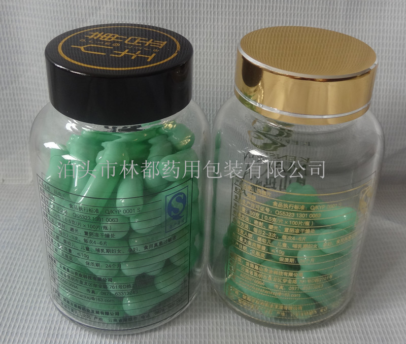 這款玻璃瓶高端、美觀,主要是用于盛裝高端產品, 如蟲草含片、瑪咖片、蟲草膠囊等,采用這款玻璃瓶盛裝產品,提升了產品的形象。