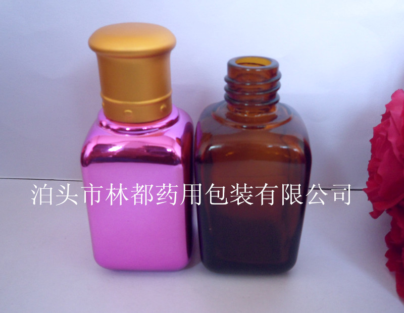 這款方形電鍍玻璃瓶的容量為30ml,可根據客戶要求電鍍成各種顏色,電鍍后的玻璃瓶外觀艷麗,精美,時尚,顯高檔,主要是用于盛裝各種高檔的化妝液體產品。