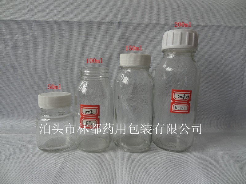 我公司生產的透明化工玻璃瓶容量有多種,有50ml,100ml,150ml,200ml,300ml,450ml,500ml,800ml。滿足了客戶不同容量的需求。透明化工玻璃瓶有盛裝液體化工產品和固體化工產品之分,圖中這幾款透明化工玻璃瓶瓶口為大口,適用于盛裝固體化工產品。