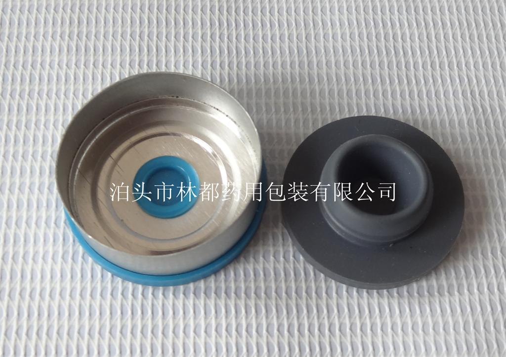 這款卡口藥用玻璃瓶所配的鋁塑組合蓋和丁基膠塞。鋁塑組合蓋,塑料部分可做成各種顏色,增加玻璃瓶的美觀性,按客戶要求訂做。