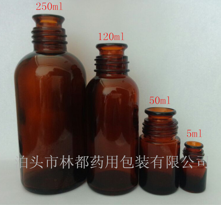 這幾款棕色玻璃瓶屬一系列的瓶型,瓶口較異型 ,是一款出口瓶型,容量有5ml、50ml、120ml、250ml,材質為鈉鈣玻璃,質量是執行YBB00272002標準,棕色玻璃瓶主要是用于避光產品。