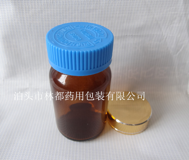 這款廣口膠囊玻璃瓶顏色為棕色,可用于盛裝對光易分解的膠囊。如圖中這款膠囊玻璃瓶配有兩種蓋子,藍(lán)色的為安全蓋,小兒不易打開;金色的為電化鋁蓋,電化鋁蓋外表美觀。